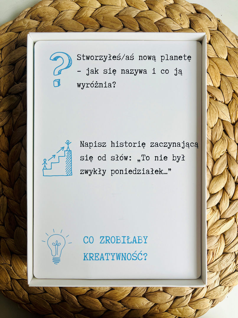 Każdy zestaw to 30 kart z pytaniami, wyzwaniami i refleksjami, które możesz wykorzystać samodzielnie lub w grupie – w domu, w szkole, na warsztatach czy w pracy.